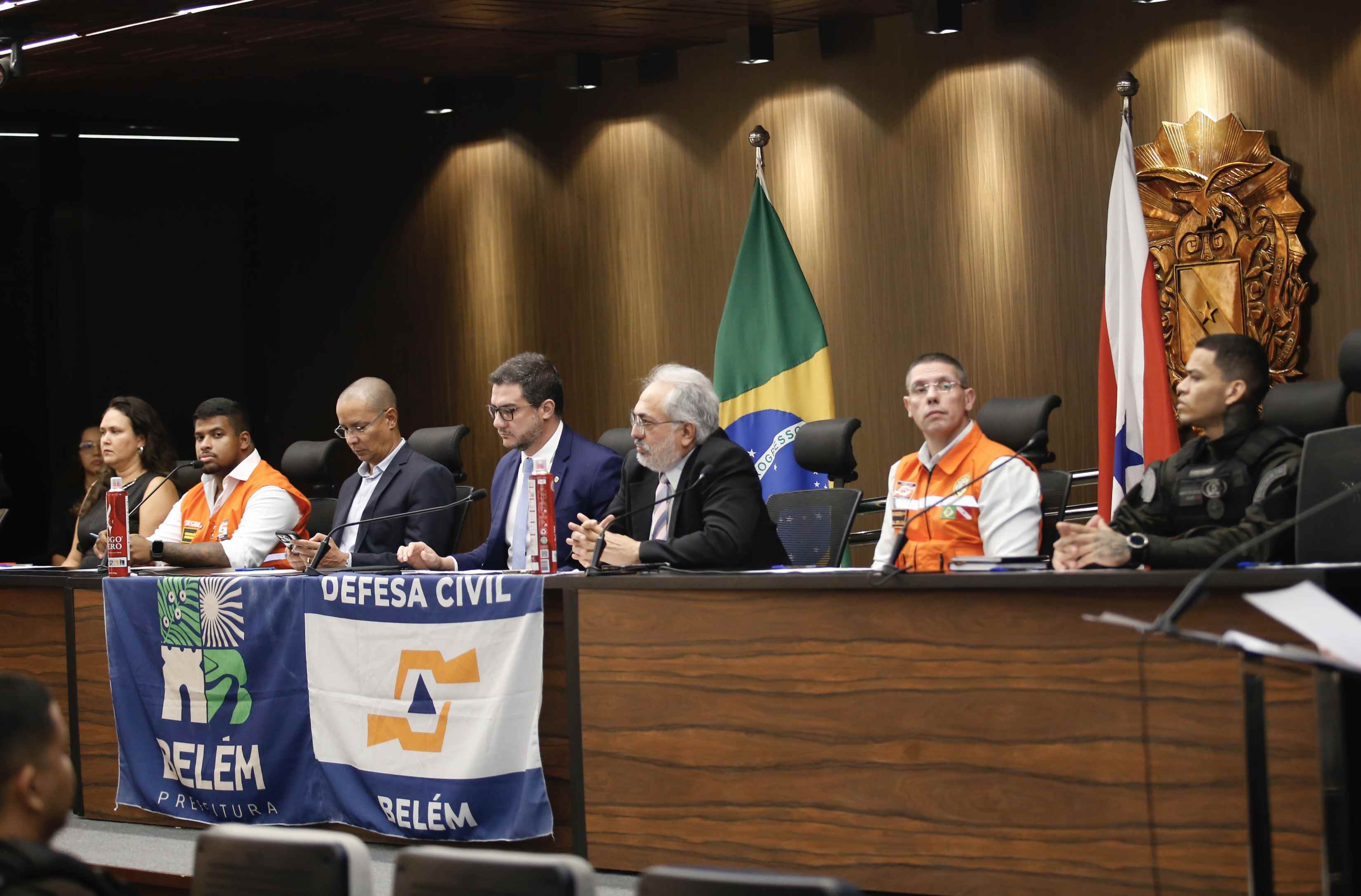 A mesa da sessão foi composta pelos seguintes convidados: Luciano Oliveira, secretário municipal de Segurança e Ordem Pública de Belém (Segbel); João Vitor Magalhães, superintendente da Defesa Civil de Belém; Raimundo Moraes, promotor de Justiça do Ministério Público do Pará; Marcelo Nogueira, coordenador adjunto da Defesa Civil Estadual; professora Milena Andrade, representando a Universidade Federal Rural da Amazônia (UFRA); Patrick Felipe, inspetor-geral da Guarda Civil de Marituba, e Jair Damasceno, prefeito do município de Curuá.