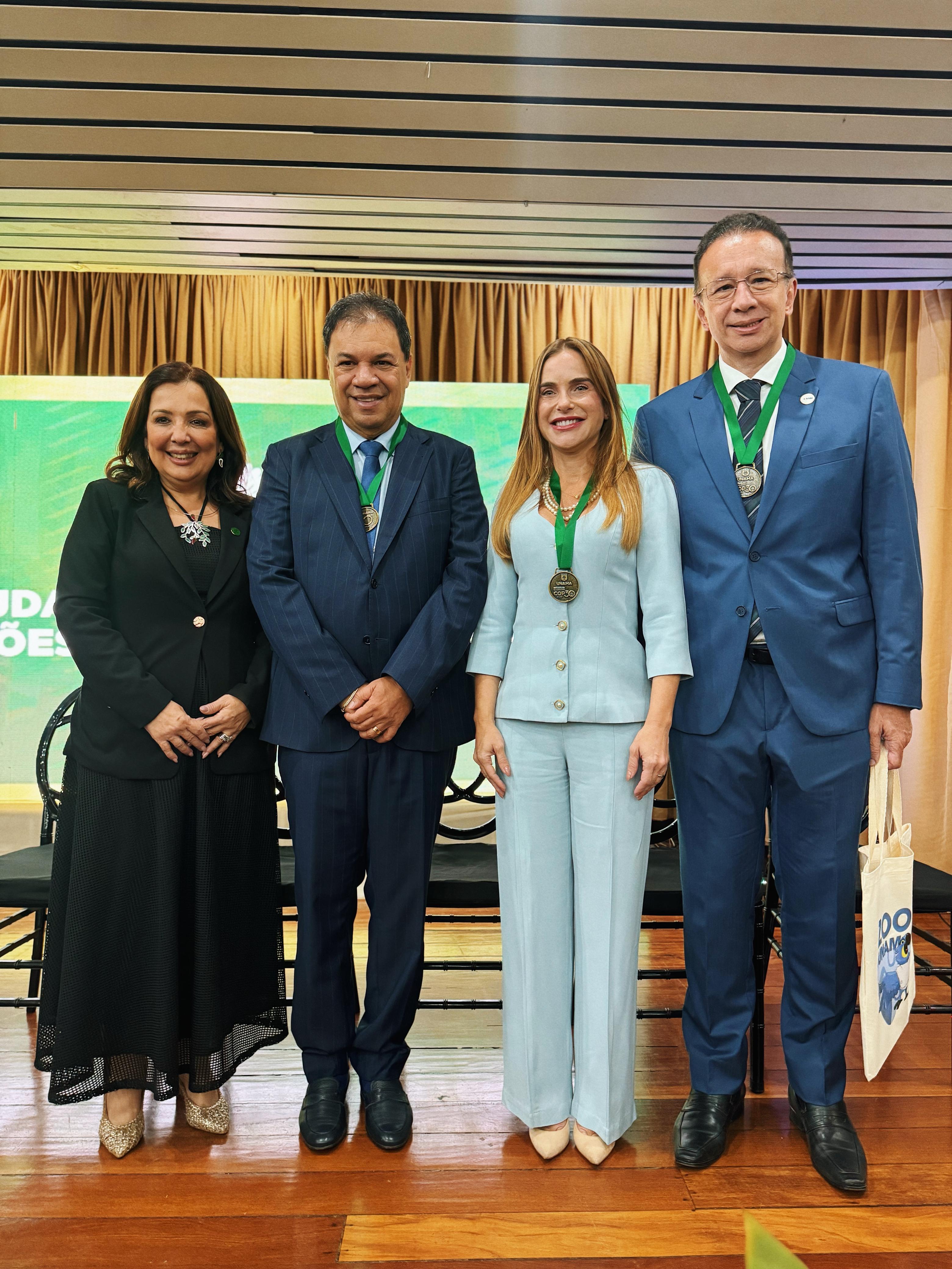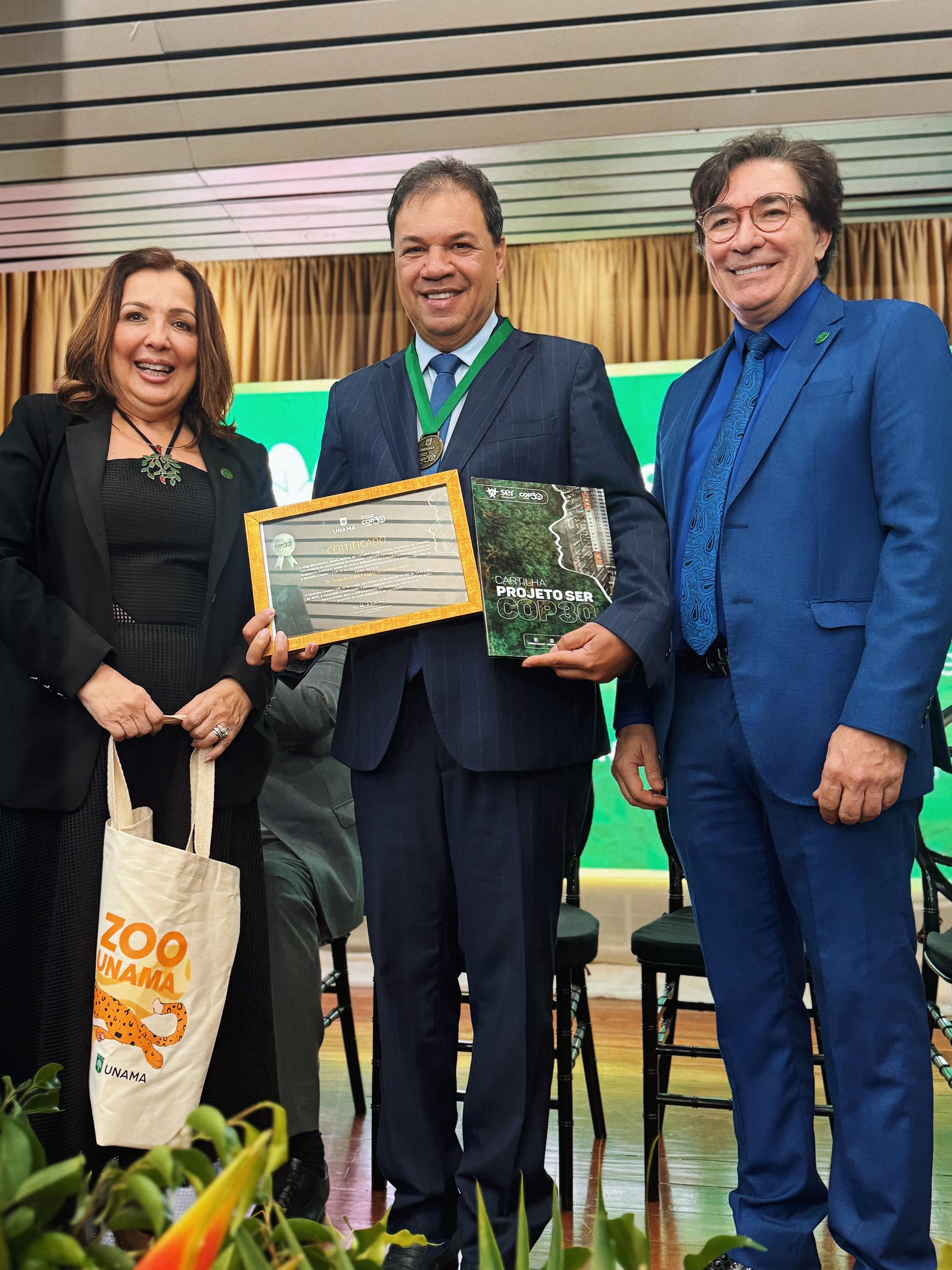 O presidente do Grupo Ser Educacional, Jânyo Diniz, e a reitora da Unama, Betânia Fidalgo Arroyo, participaram da entrega da comenda. O Congresso Internacional Stricto Sensu tem como tema central “Mudanças Climáticas e Relações Sociedade-Natureza” e faz alusão à COP30 (Conferência das Nações Unidas sobre Mudanças Climáticas), que será sediada em Belém no próximo mês.
