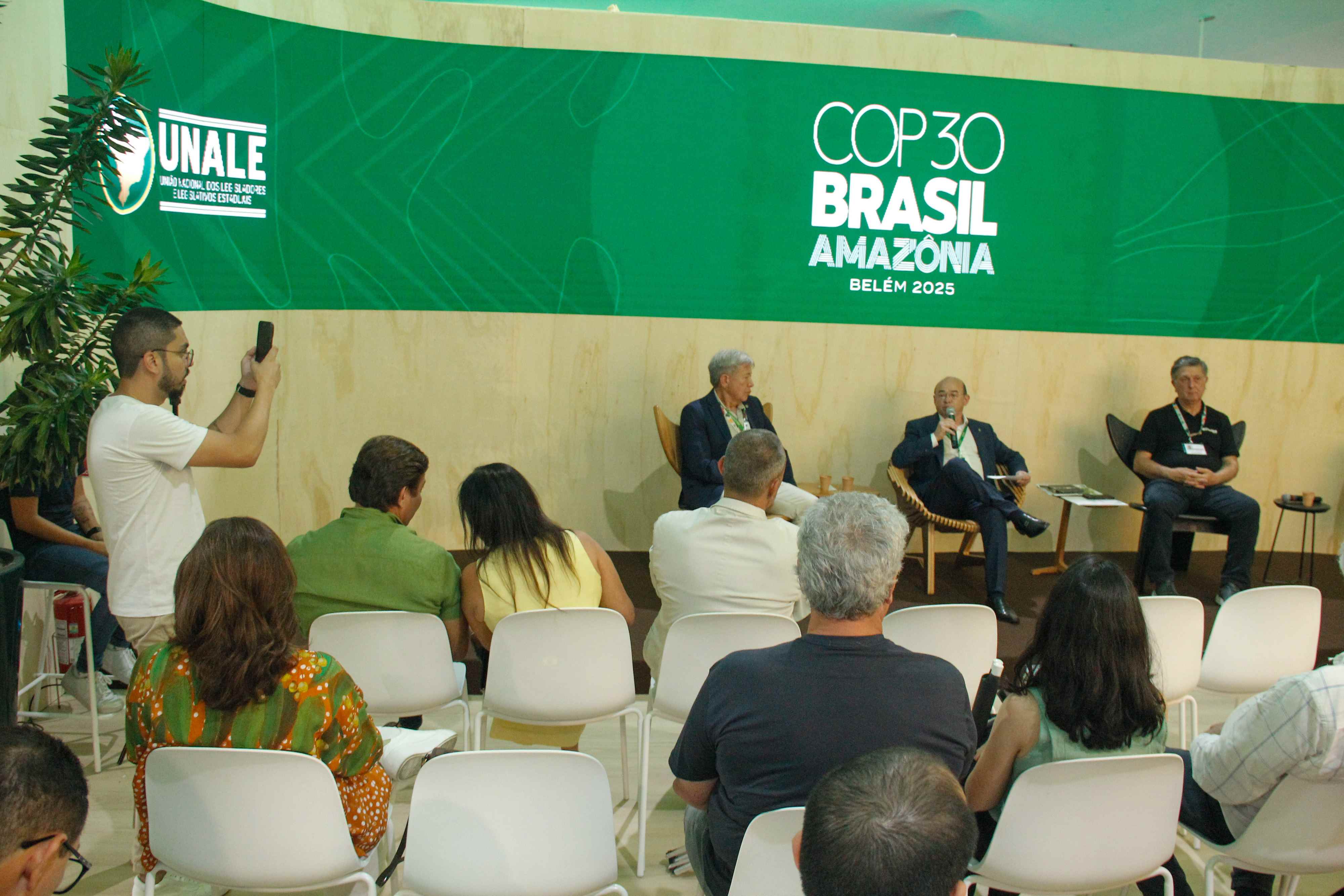O deputado cearense Sérgio Aguiar conduziu o primeiro painel da programação vespertina que apresentou ao público presente no estande da Alepa a ''Carta da Unale à COP 30 – Contribuições Legislativas para a Ação Climática''. A carta é oriunda de uma série de avaliações de um conjunto de ações das 27 Assembleias Legislativas de todo o país, baseado nas experiências e propostas das Casas Legislativas de Santa Catarina, Minas Gerais, Mato Grosso e Rio Grande do Sul, e propõe a consolidação de uma agenda federativa de enfrentamento às mudanças climáticas.