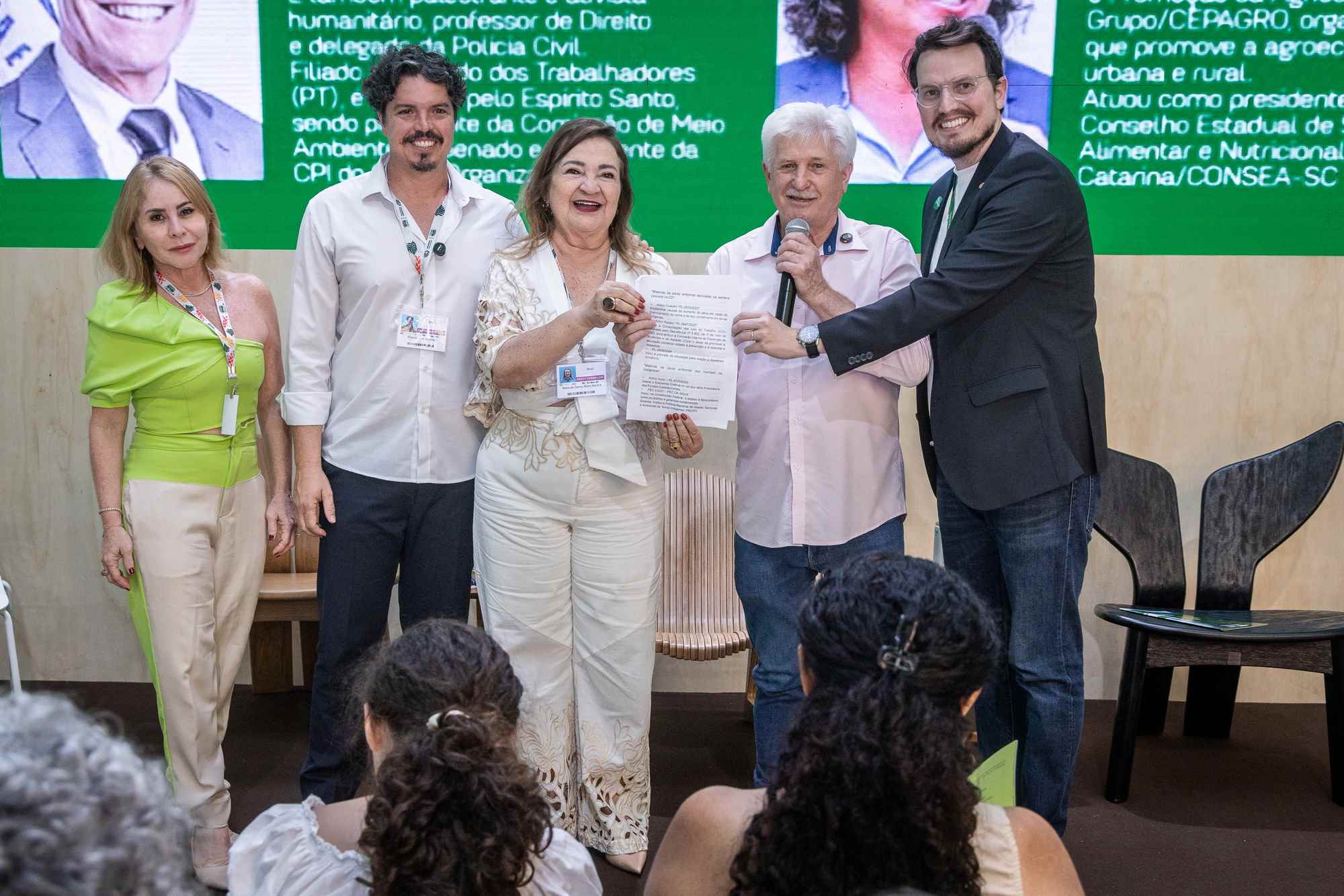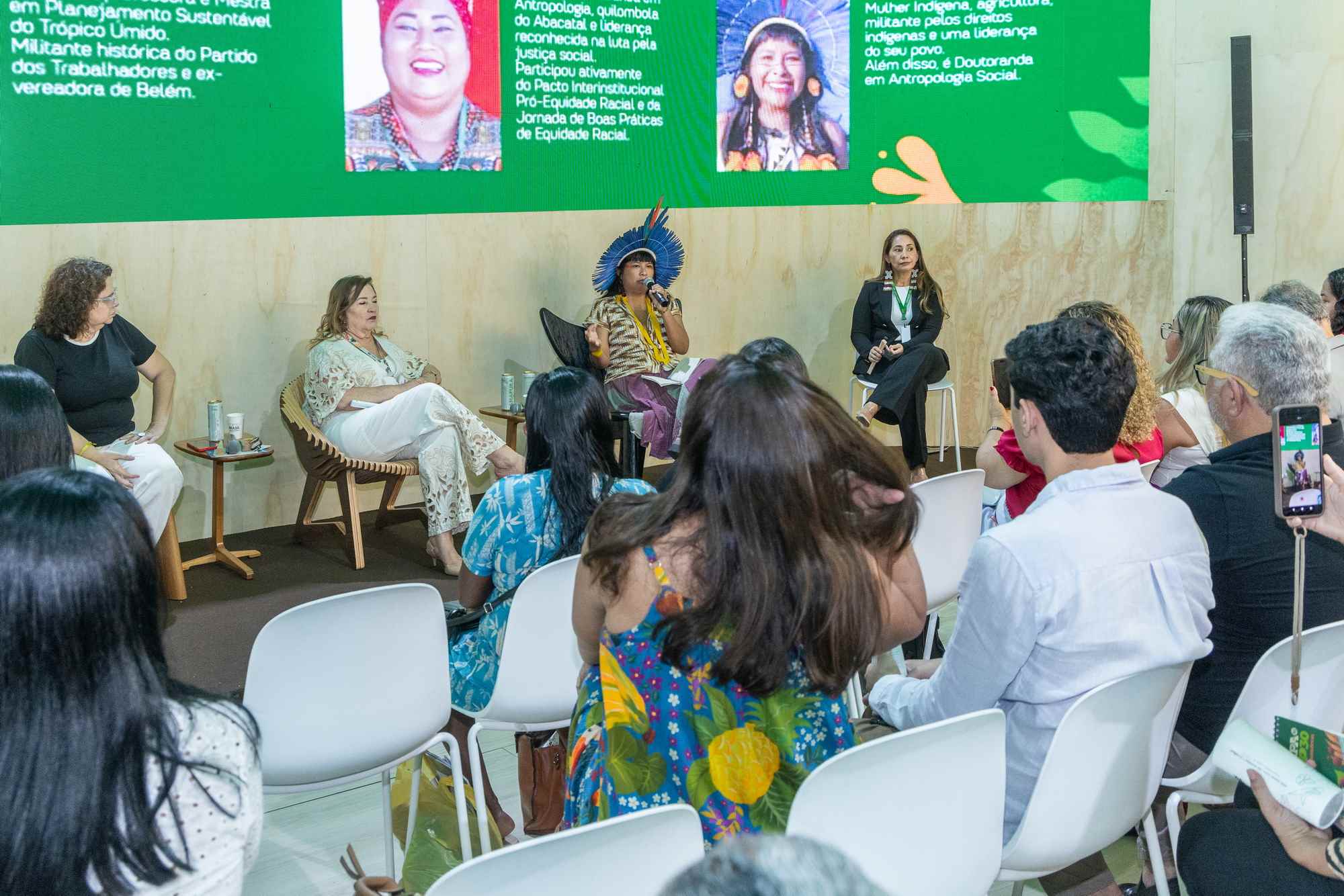 O terceiro dia de debates no estande da Assembleia Legislativa do Estado do Pará (Alepa), na Green Zone, contou com o painel “A luta das mulheres por justiça climática”, coordenado pela deputada Maria do Carmo (PT), presidente da Comissão de Meio Ambiente, Recursos Hídricos e Desenvolvimento Sustentável da Assembleia Legislativa do Pará, e debatido por Raquel Tupinambá, agricultora e militante pelos direitos indígenas; Vanusa Conceição, socióloga e mestranda em antropologia, quilombola da comunidade do Abacatal; e Milene Lauande, coordenadora de Gênero e Diversidade da Universidade Federal do Pará (UFPA) – Diverse/UFPA, e mestra em planejamento sustentável do Trópico Úmido.