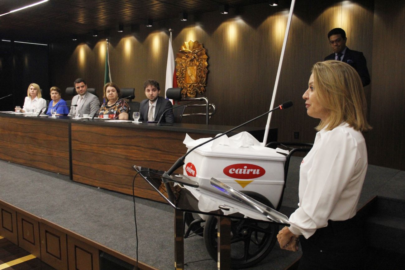 Renee Laiun Valério, uma das diretoras da empresa, agradeceu a homenagem prestada pela Alepa.Bastante emocionada, Renee Laiun Valério, uma das diretoras da empresa, agradeceu a homenagem prestada pela Alepa e lembrou dos desafios em manter uma empresa familiar ao longo de 60 anos, de forma sólida e bastante reconhecida no mercado. "Foi com imensa satisfação que todos nós, colaboradores em geral, recebemos essa homenagem proposta pelo deputado Gustavo Seffer, a quem eu estendo os meus agradecimentos. Posso dizer que a Cairu lutou muito para chegar até aqui, sendo uma empresa genuinamente paraense e oferecendo aos seus clientes sorvetes com sabores e frutas oriundos da região amazônica", reforçou.