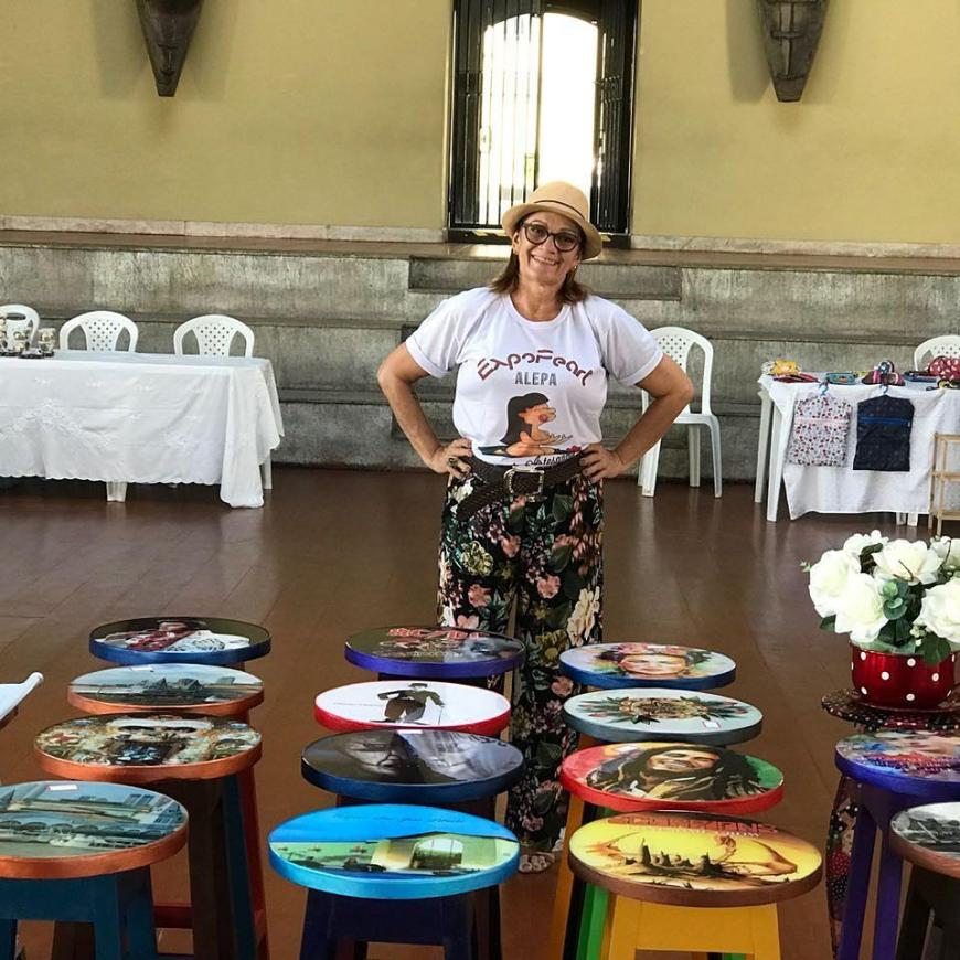 Papel de decoupage, tecidos, retalhos, pastilhas de lajotas, almofado, pátina envelhecida ou laqueada, tudo pode ser usado na produção das peças. Entre seus trabalhos em pintura, os banquinhos ganham figuras de pontos turísticos de Belém, cantores de rock, crianças, atores e cantores internacionais e nacionais, além das paixões por times de futebol, como o Remo e o Payssandu. As peças são vendidas, mas a felicidade de Lu é completa quando agrada plenamente seu cliente e com isso sua autoestima levanta vôo.