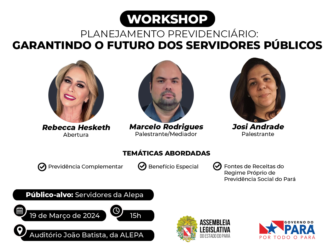 Servidores públicos da Assembleia Legislativa do Pará (Alepa) terão a oportunidade de participar de um workshop de Planejamento Previdenciário. Com o tema "Garantindo o Futuro dos Servidores Públicos", o evento será nesta terça-feira (19), no auditório João Batista, às 15h.