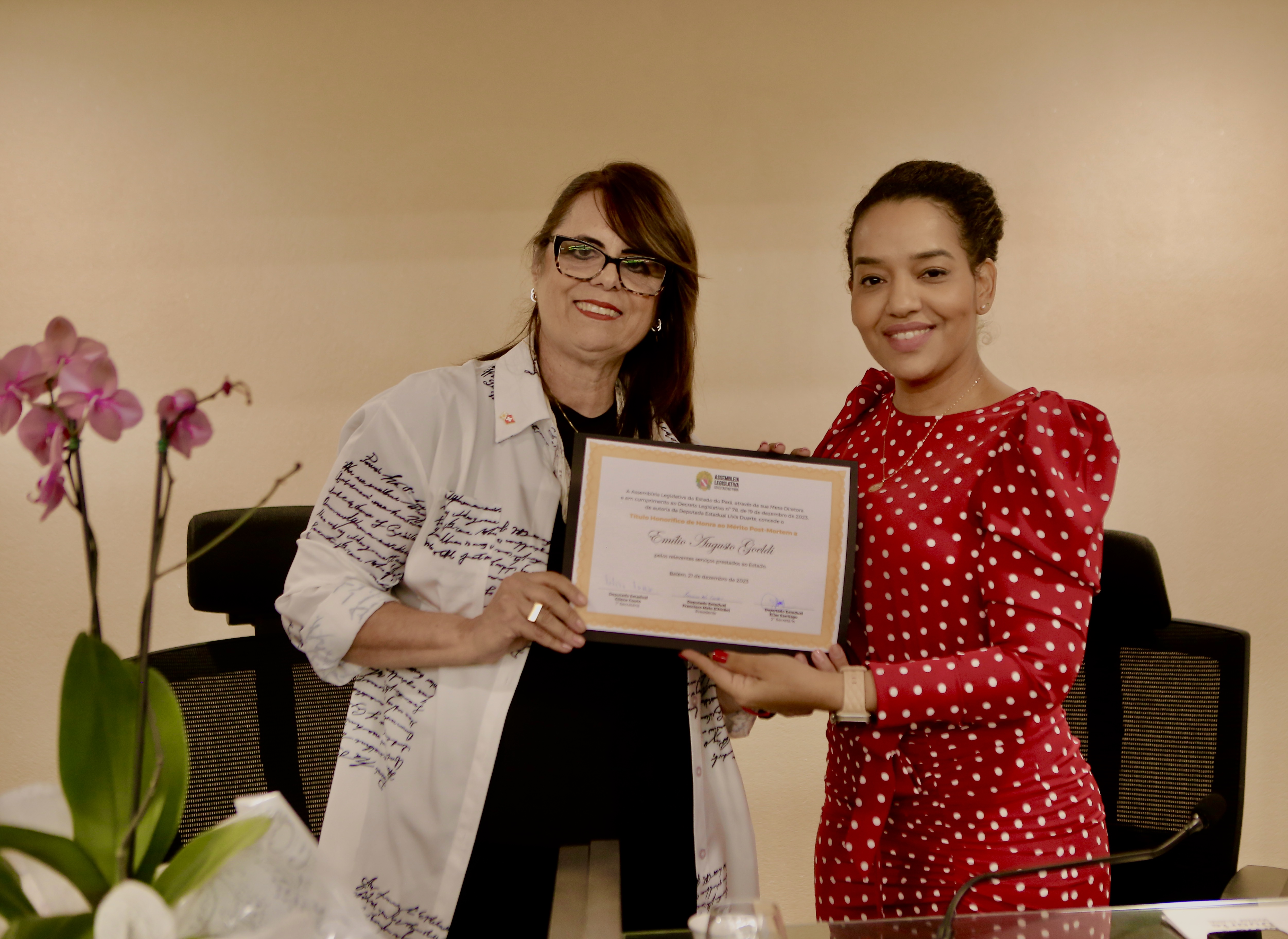 O título foi entregue à bisneta de Emílio Goeldi, a escritora e curadora de arte Sra. Lani Goeldi. “É com muita alegria que venho a esta Casa de Leis pela primeira vez, recebendo esta homenagem. É com honra e profunda gratidão que represento meu bisavô e minha família. Emílio Goeldi foi um pioneiro no estudo da natureza que transcende gerações. A transmissão desse legado é importante para que as pessoas saibam de seu papel na arte, na ciência e na diversidade ambiental”, destacou Lani Goeldi.